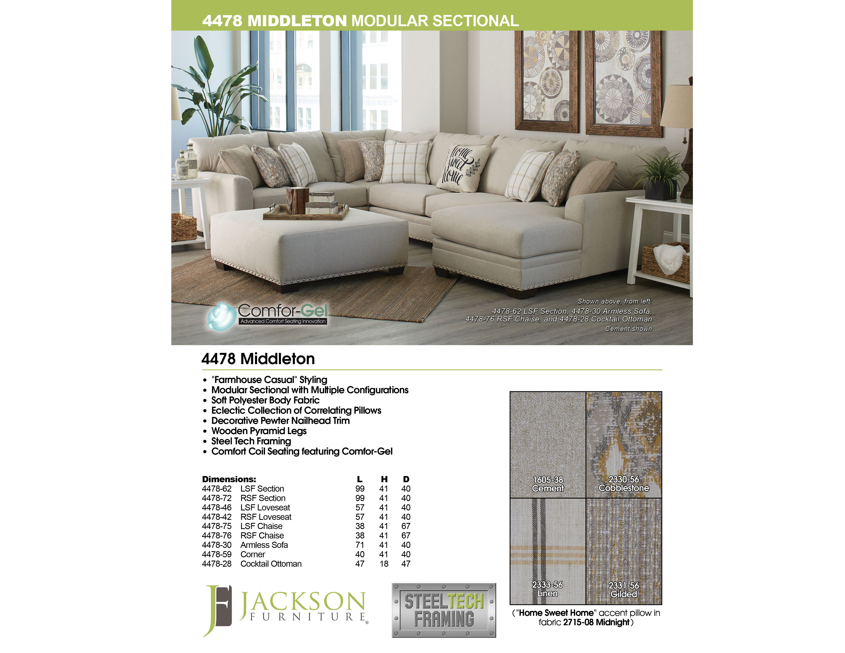 Jackson Furniture Middleton Sectional / Be the first to review this product ask a question (1 question) $1,280.60.. Lindy's furniture company is a local furniture store, serving the hickory, connelly springs, morganton, lenoir area. Comfortable and stylish furniture is assembled right here in the u.s.a by more than 1,500 employees using a combination of classic assembly techniques and new technology. Contact us for the most current availability on this product Jackson is designed for comfort.made to last! Contact us for the most current availability on this product.